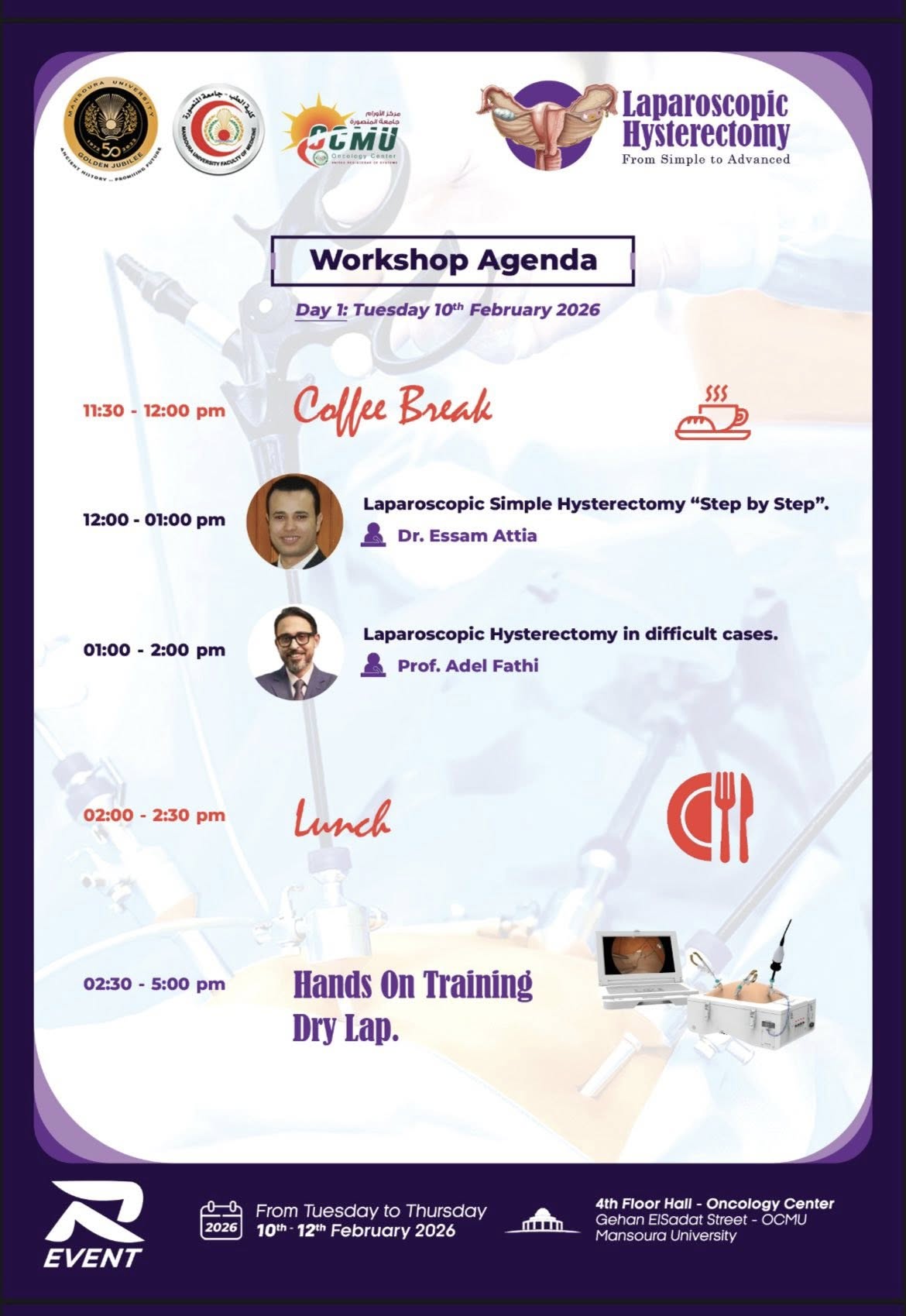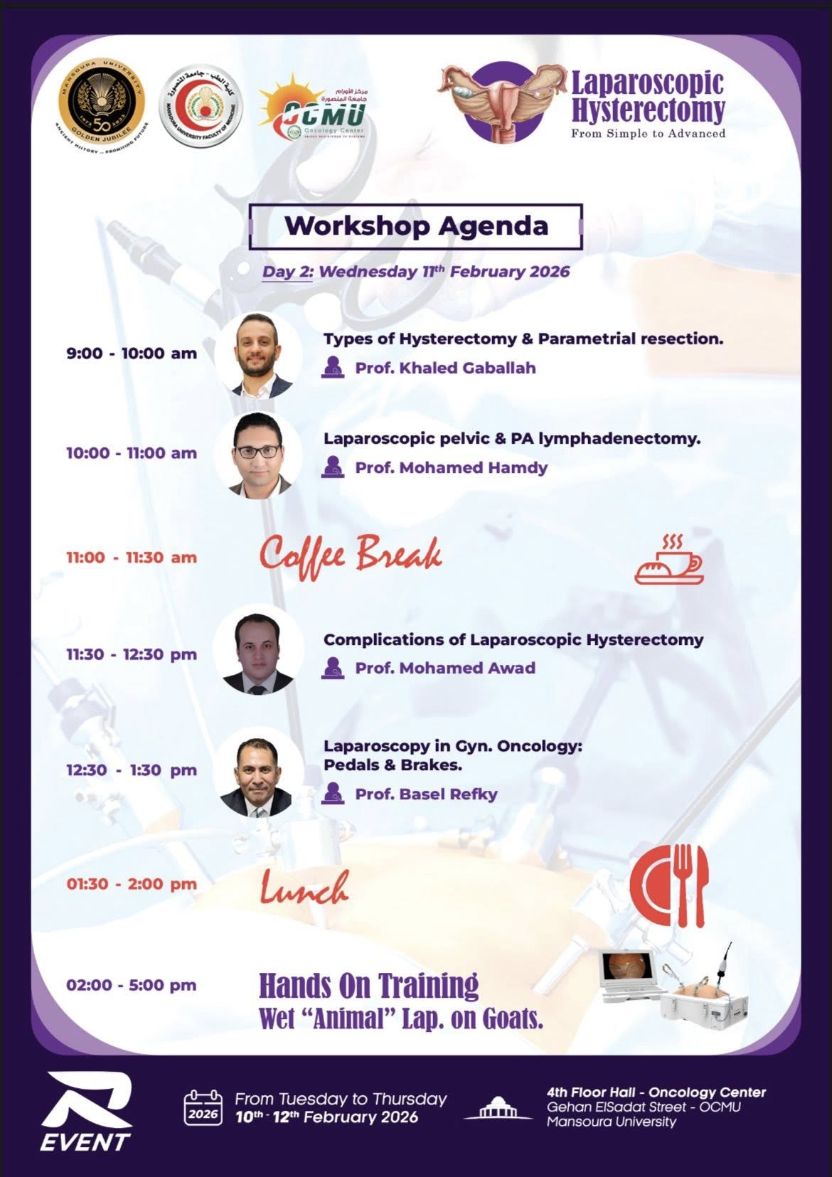 محاضرات علمية: جلسات نقاشية تغطي أحدث البروتوكولات العالمية في استئصال الرحم البسيط والمتقدم.