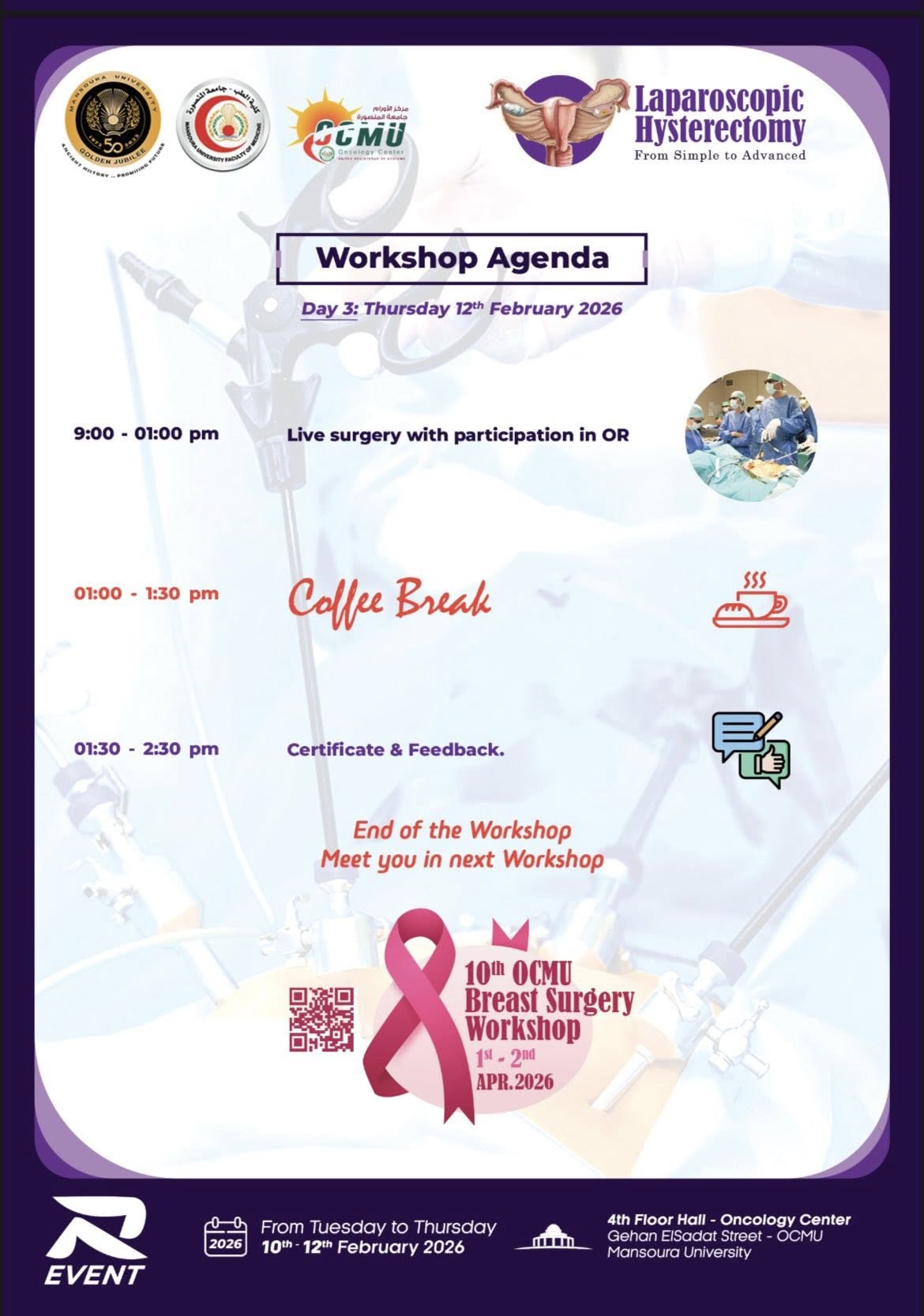 تأتي هذه الورشة استجابةً للتطور المتسارع في جراحات المناظير، وتهدف إلى تمكين الجراحين من إتقان أحدث التقنيات الجراحية تحت إشراف قامات علمية مرموقة.